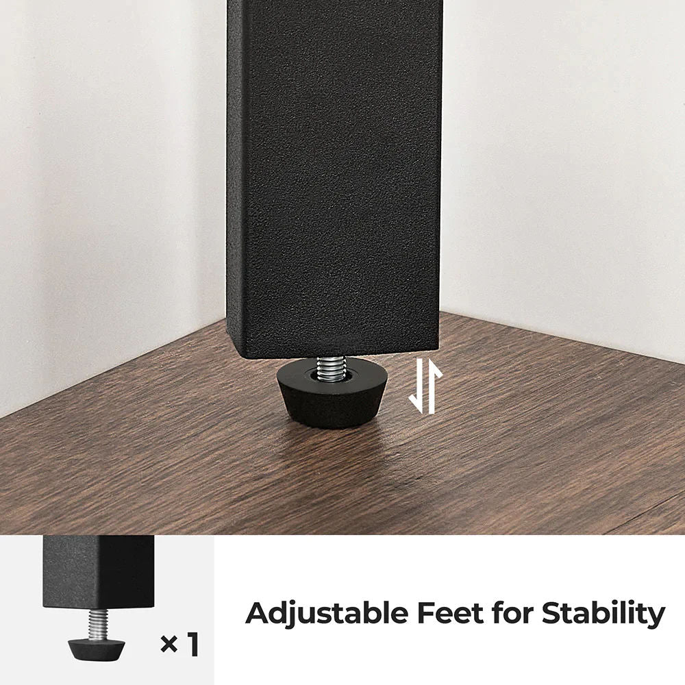 - Experience peace of mind with this corner shelf organiser. Its three-legged structure provides stability, while the 3 protective caps on the bottom - one adjustable - ensure it fits securely on uneven surfaces. Plus, anti-toppling fittings anchor it to the wall for added safety.