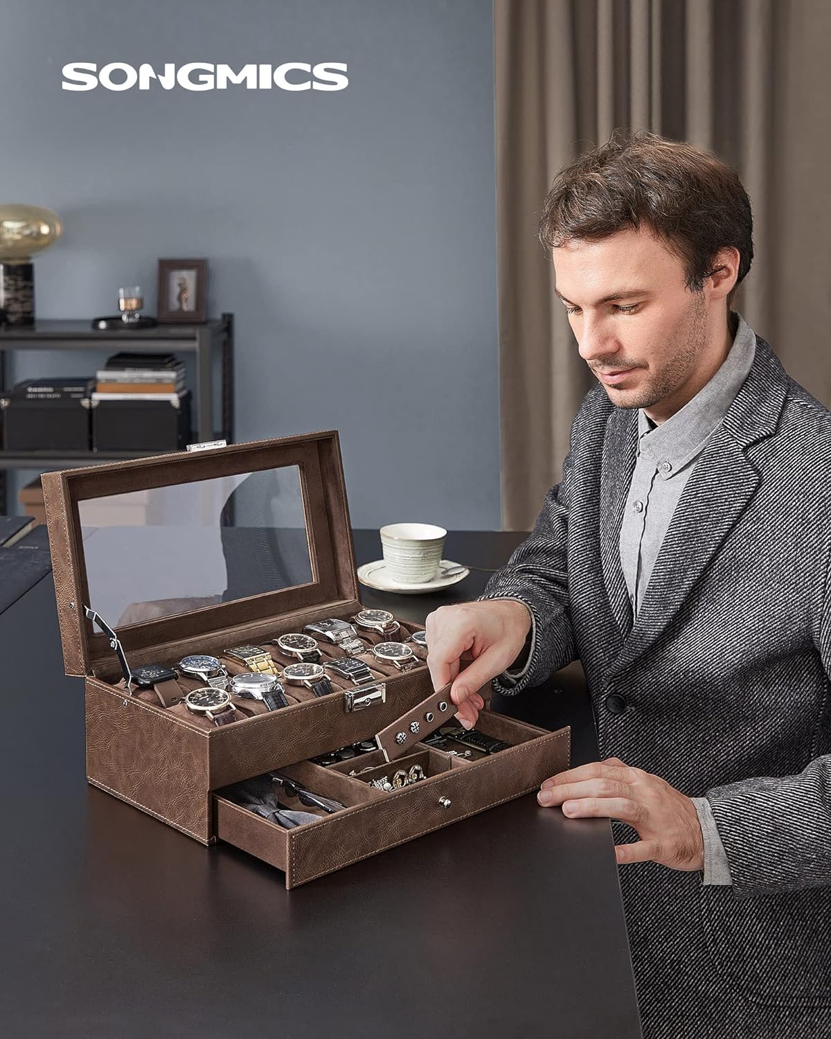 SONGMICS 2-Tier Watch Box for 12 Watches with Glass Lid and 1 Drawer Brown Lining