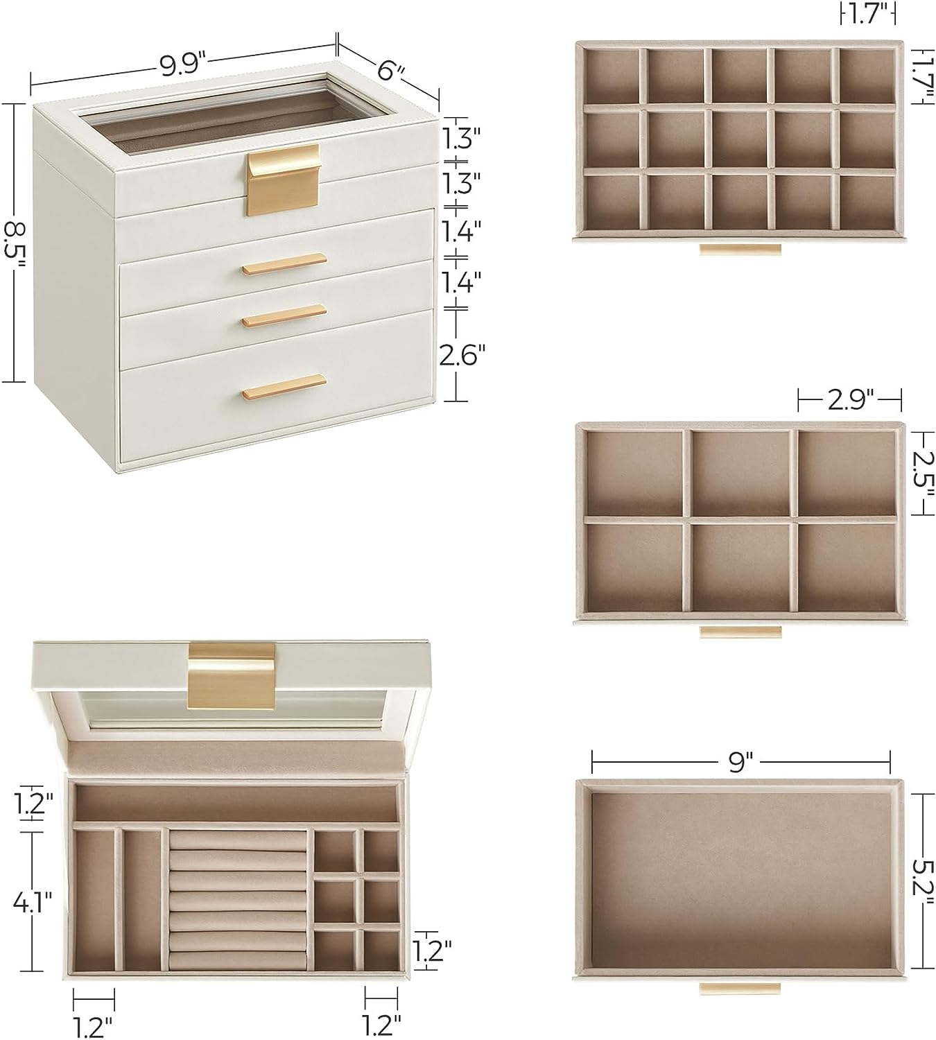 SONGMICS 4-Layer Jewelry Box with 3 Drawers and Glass Lid Cloud White and Gold Color