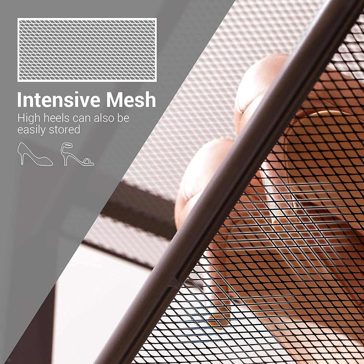- Adjustable Shelf: The inclination of our shoe organizer rack can be adjusted to flat or angle according to your usage habits; Each shelf has a baffle and dense mesh layer design to prevent high heels from falling for easier access to shoes. Metal shoe racks after stacking can disassemble one shelf to provide adequate storage space for taller boots
