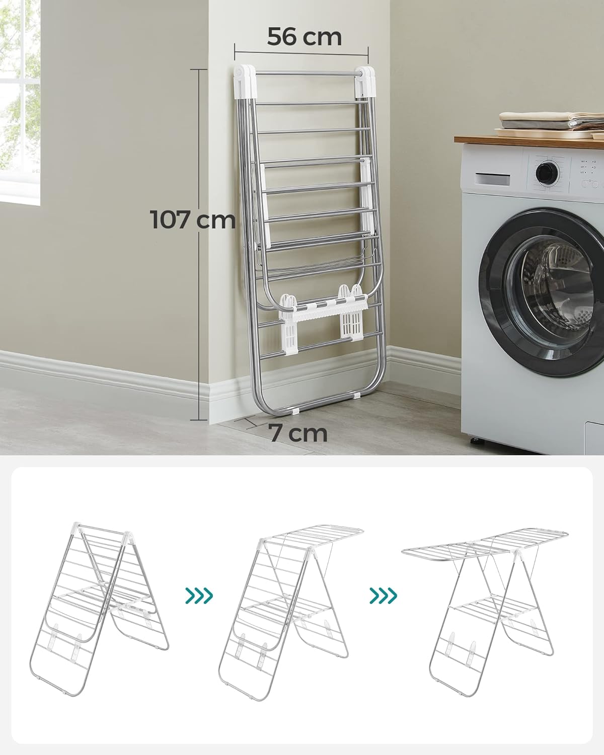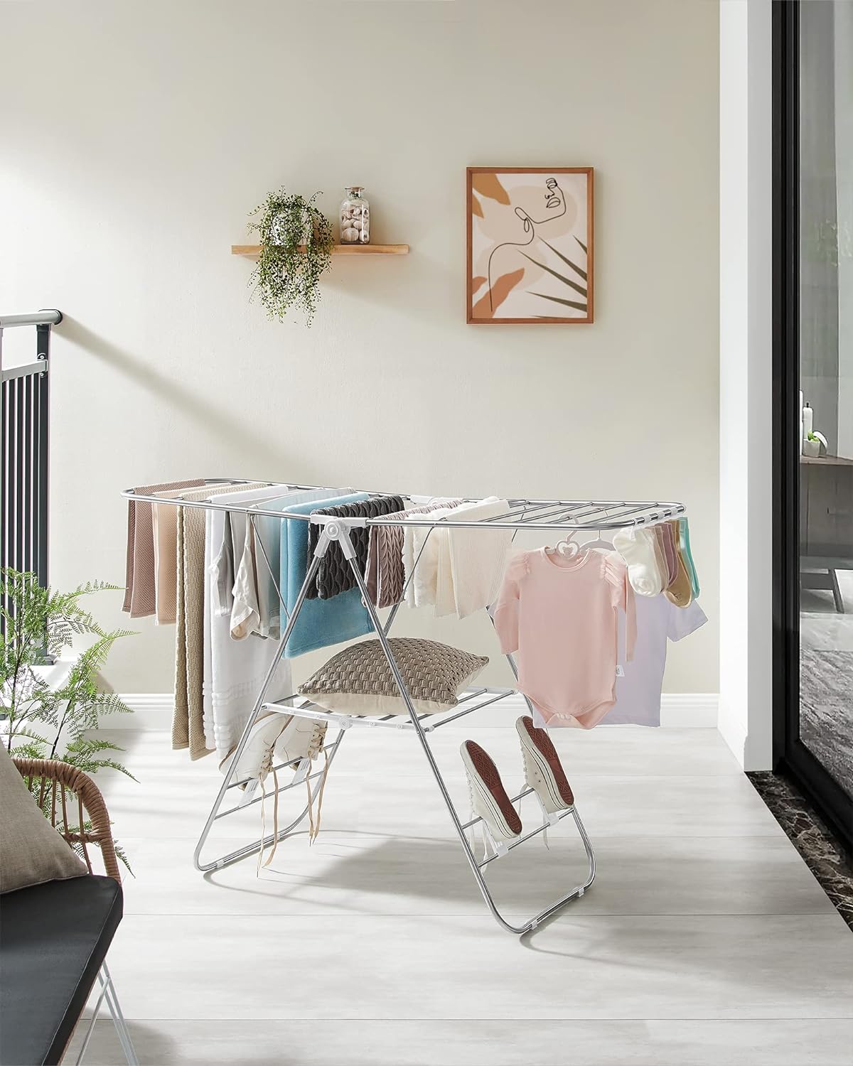 SONGMICS Foldable Clothes Drying Rack with Adjustable Wings Stainless Steel White and Silver LLR502W01