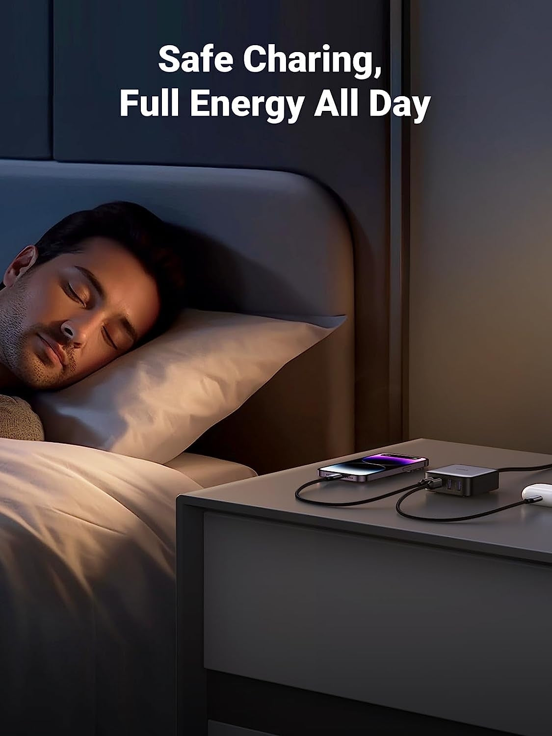 Featuring Dynamic Temperature Sensors that actively monitor temperatures and an intelligent PMW chip that adjusts power outputs to safeguard your connected devices. A UL94-V0 rating shell along with an efficient heat dissipation structure ensures safe overnight charging.