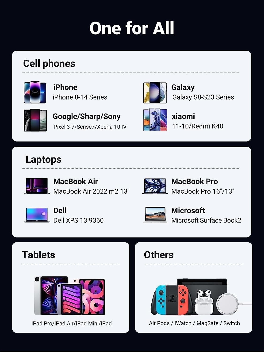 UGREEN desktop USB charging station supports Power Delivery 3.0/Quick Charge 4+/PPS/AFC/5V2.4A/BC1.2 charging protocols. Compatible with MacBook Pro, MacBook Air, Dell XPS, iPhone 14/13/12 series, Galaxy S23/S22 series (25W Max), iPad, Steam Deck and more.