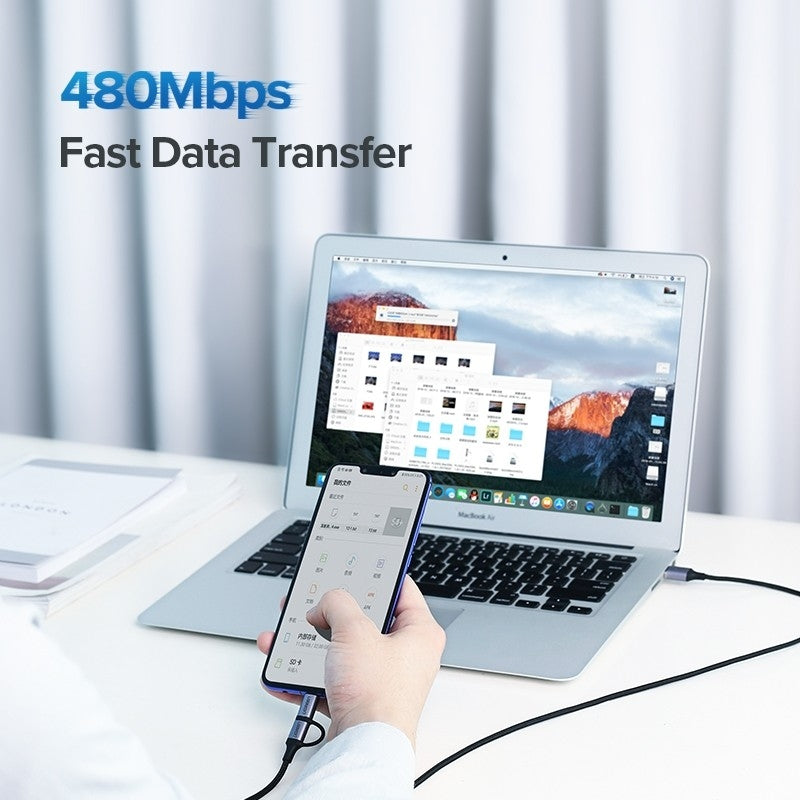 This Ugreen cable will replace two others. A cable with a micro USB end, equipped with an adapter for a USB Type-C connector, will allow you to charge the battery and transfer data to phones with these two types of connectors.