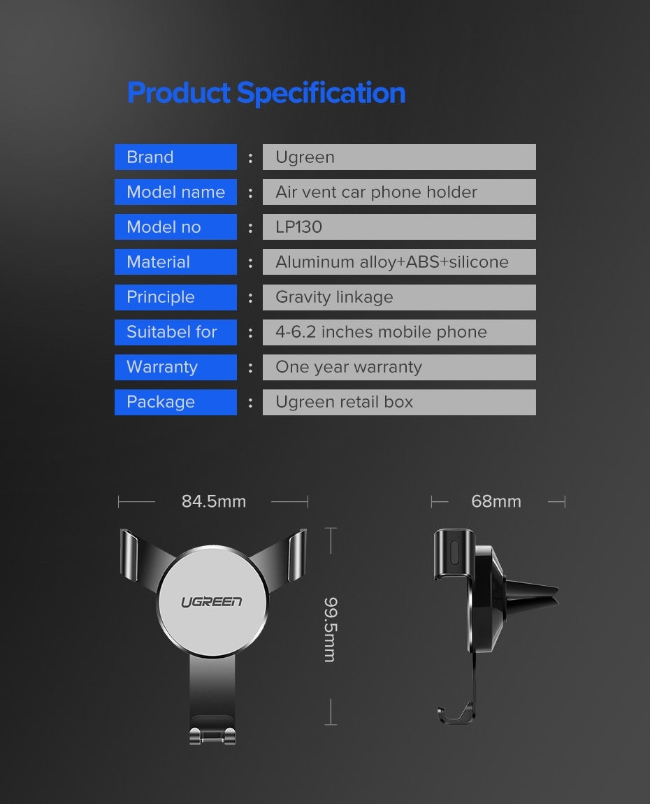 UGREEN 40907 Gravity Drive Air Vent Mount Phone Holder