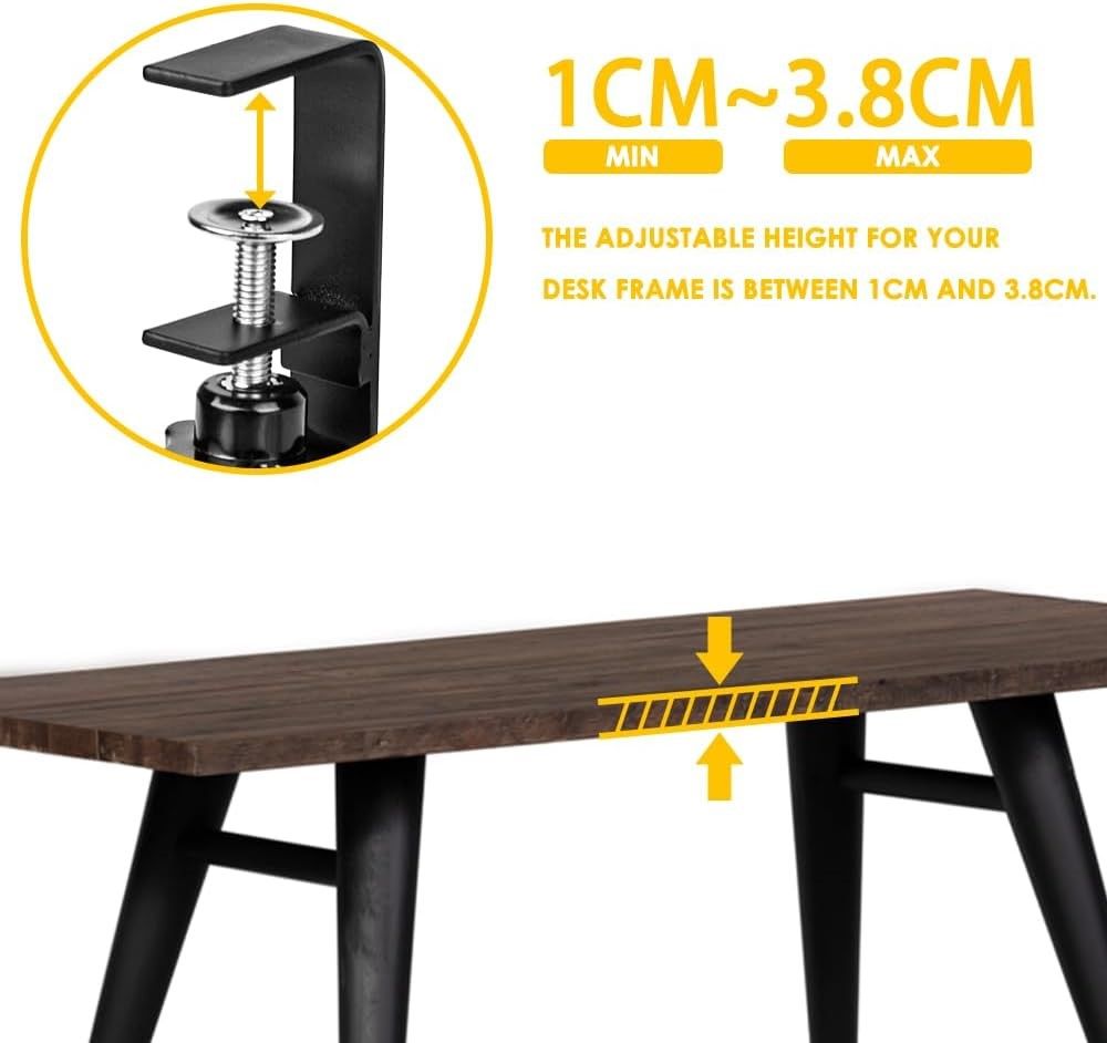 - Easily install this product in minutes to any desk frame up to 3.81 cm thick without needing to drill any holes or modify the desktop. The clamps are padded to protect your desk surface from damage, and the small screwer included makes assembly a breeze. Plus, you can remove, move, or transfer it to another table without leaving any holes.