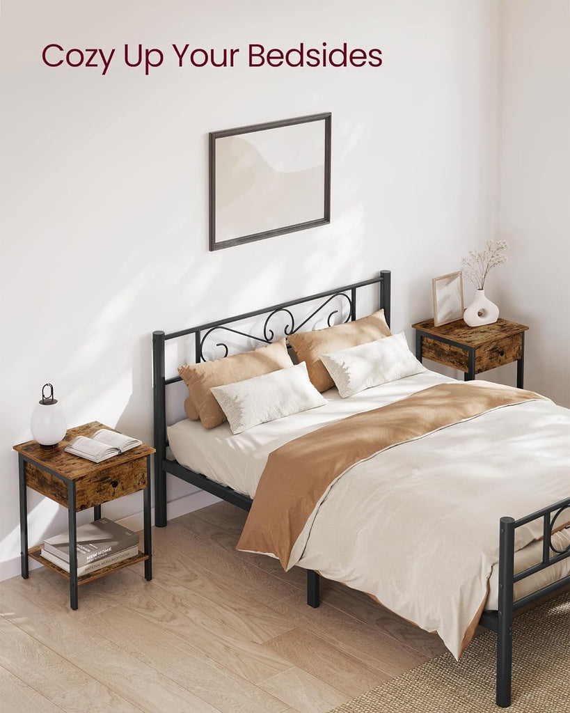 - Embrace an Industrial Vibe: Mixing rustic brown with matte black, this nightstand emits an industrial vibe in your bedroom. It can also catch eyes as a side table or end table throughout the home
