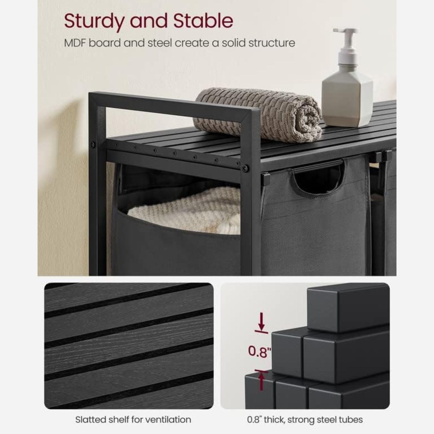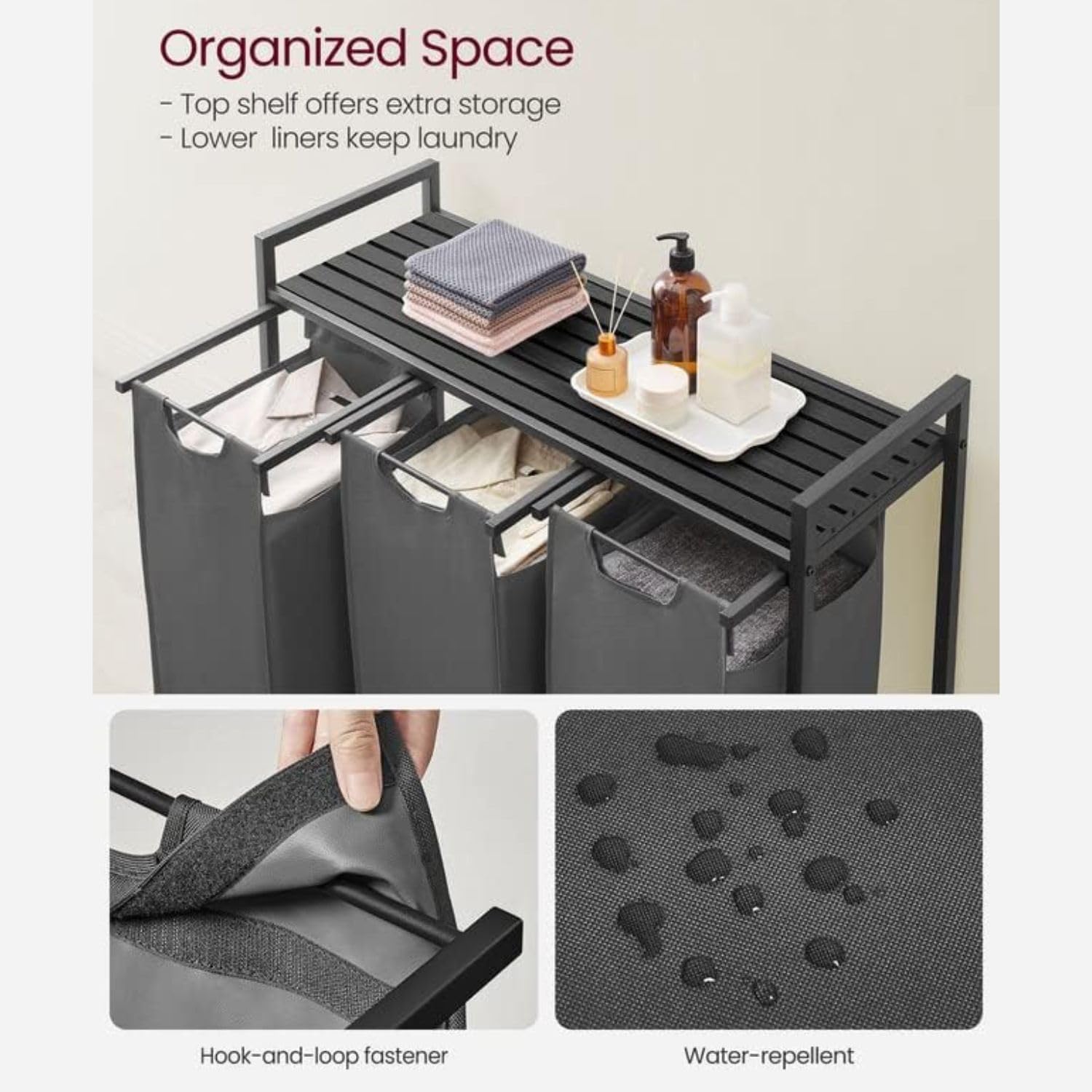Each liner is equipped with a plastic bottom panel to prevent sagging, and thanks to the hook-and-loop fastener, you can effortlessly pull out and remove these liners to easily transport them to the washing machine - Robust & Stable: This laundry sorter features a sturdy 0.8� steel tube frame and MDF panel, supporting up to 44 lb on its top shelf. Moreover, each liner is crafted from water-repellent Oxford fabric, while the four adjustable feet provide added stabilityy