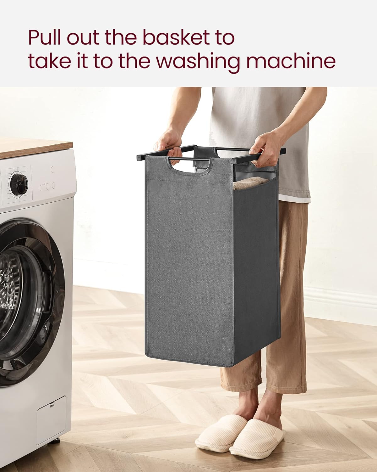 The liner is equipped with a sturdy plastic bottom panel to prevent sagging, and thanks to the hook-and-loop fastener, you can effortlessly pull out the liner and remove it for easy transportation to the washing machine - Sturdy & Stable: With a 0.8� steel tube frame and MDF panel, the shelf of this laundry organizer is robust and can hold up to 44 lb. Additionally, the four adjustable feet offer extra stability
