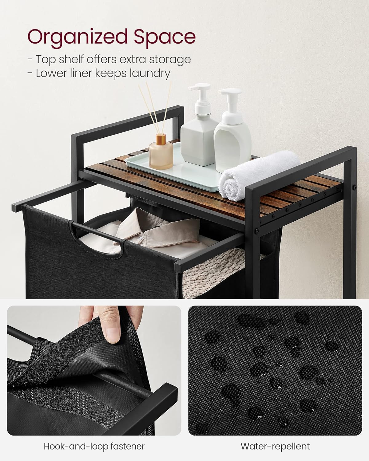 VASAGLE Laundry Hamper with Shelf and Pull-Out Bag 65L Rustic Brown and Black
