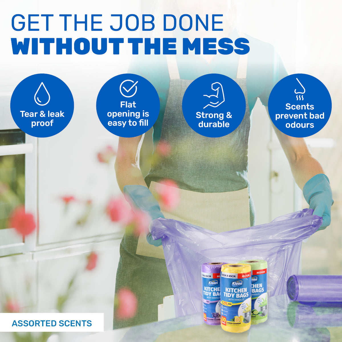 X-TRA KLEEN® Kitchen tidy bags that are scented to help eliminate nasty odours. Brightly coloured with sturdy handles they are ideal to use in your kitchen, laundry, garage or office.