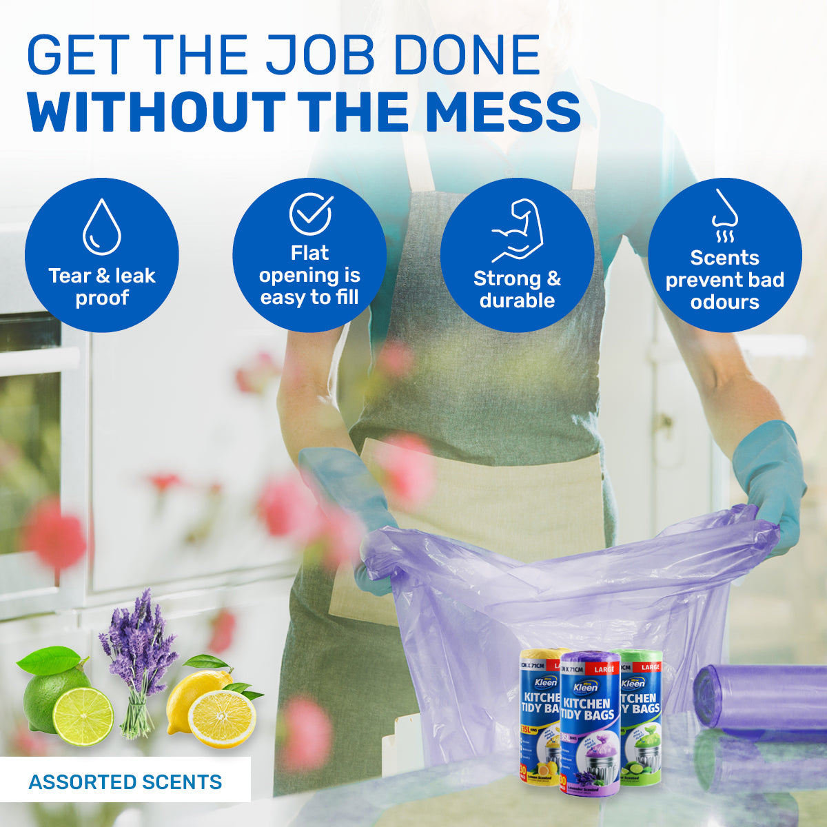 X-TRA KLEEN® Strong and durable these kitchen tidy bags are scented in fresh fragrances, eliminating odours. Ideal for use in your kitchen, laundry, garage, work or office.